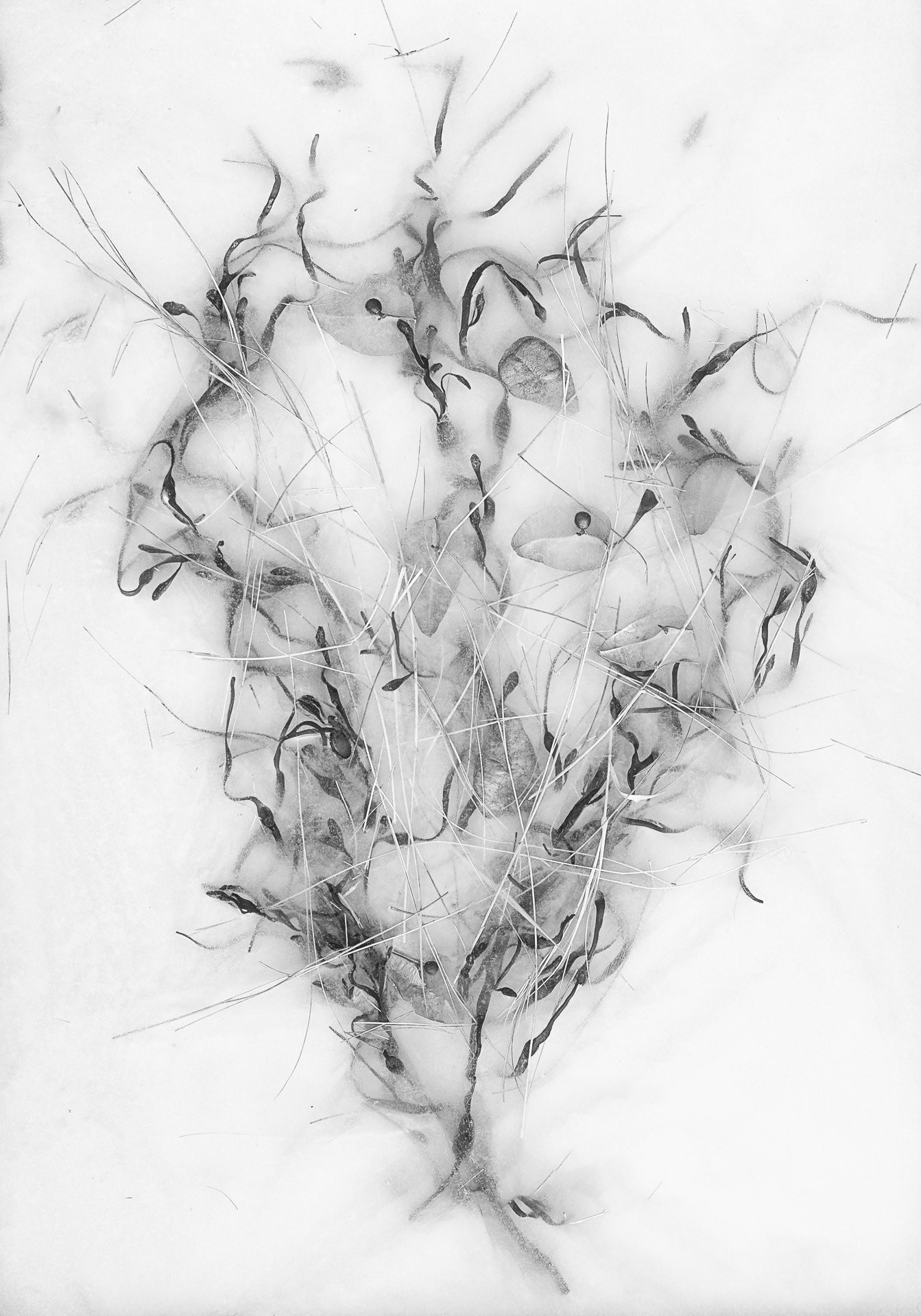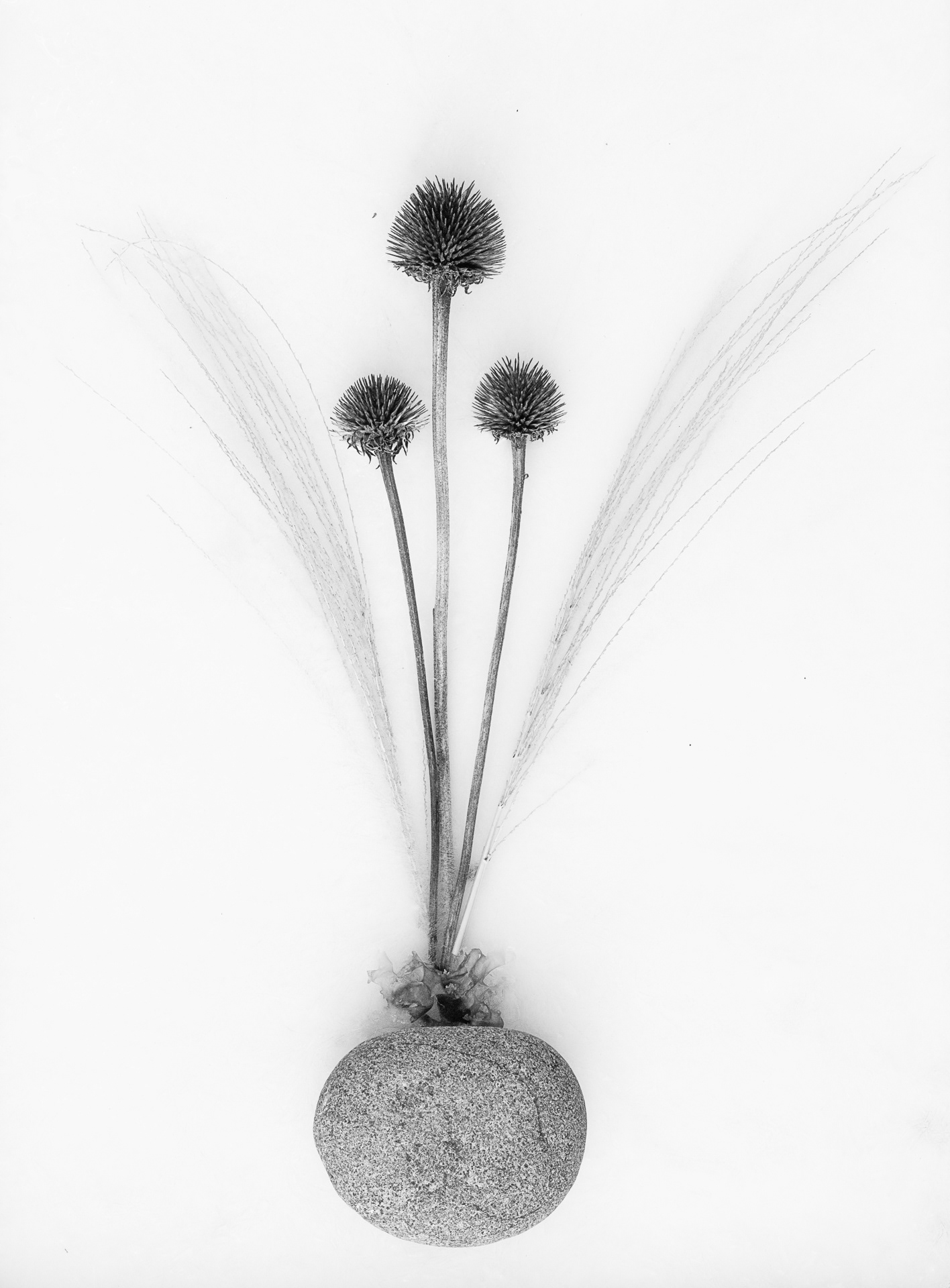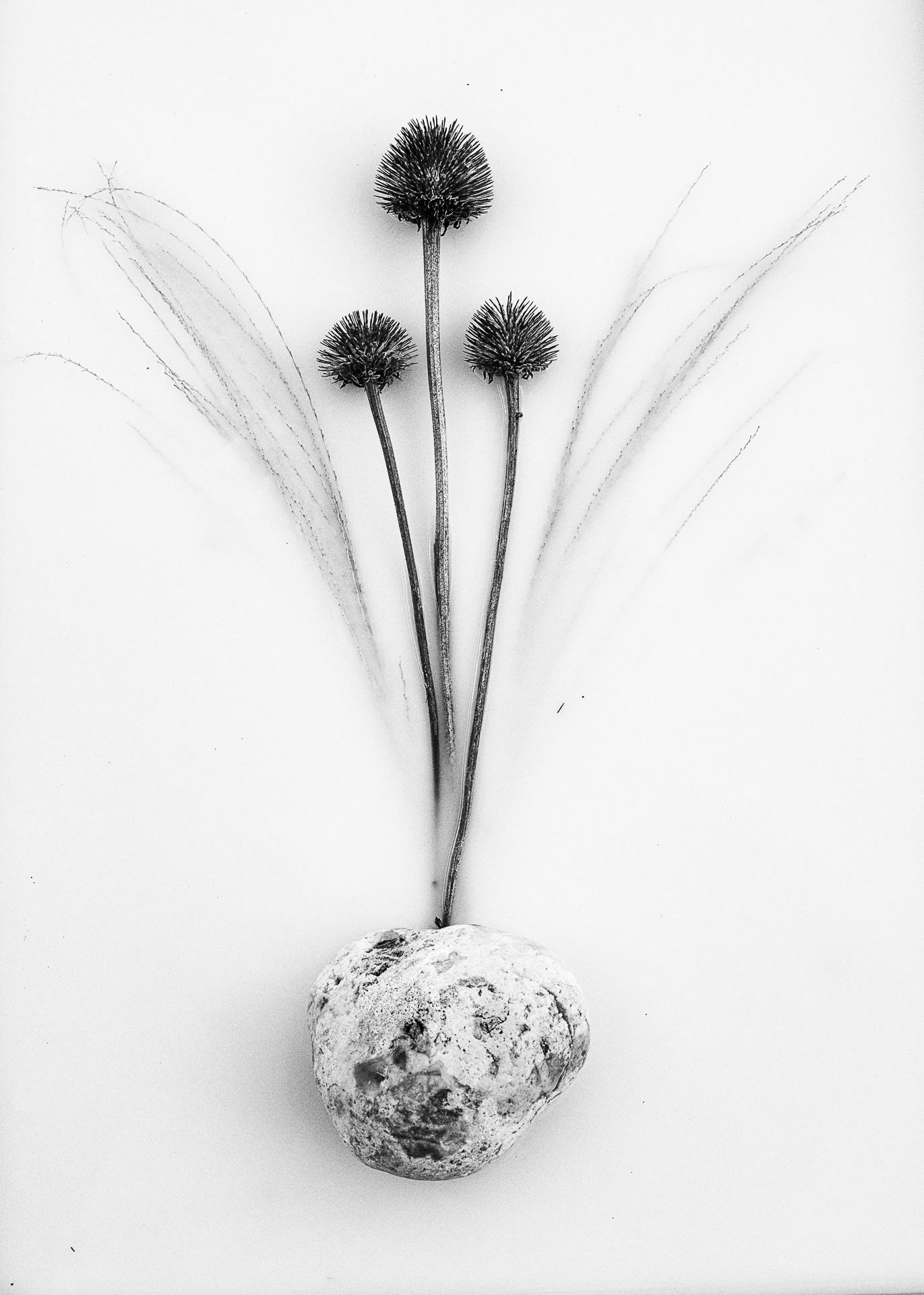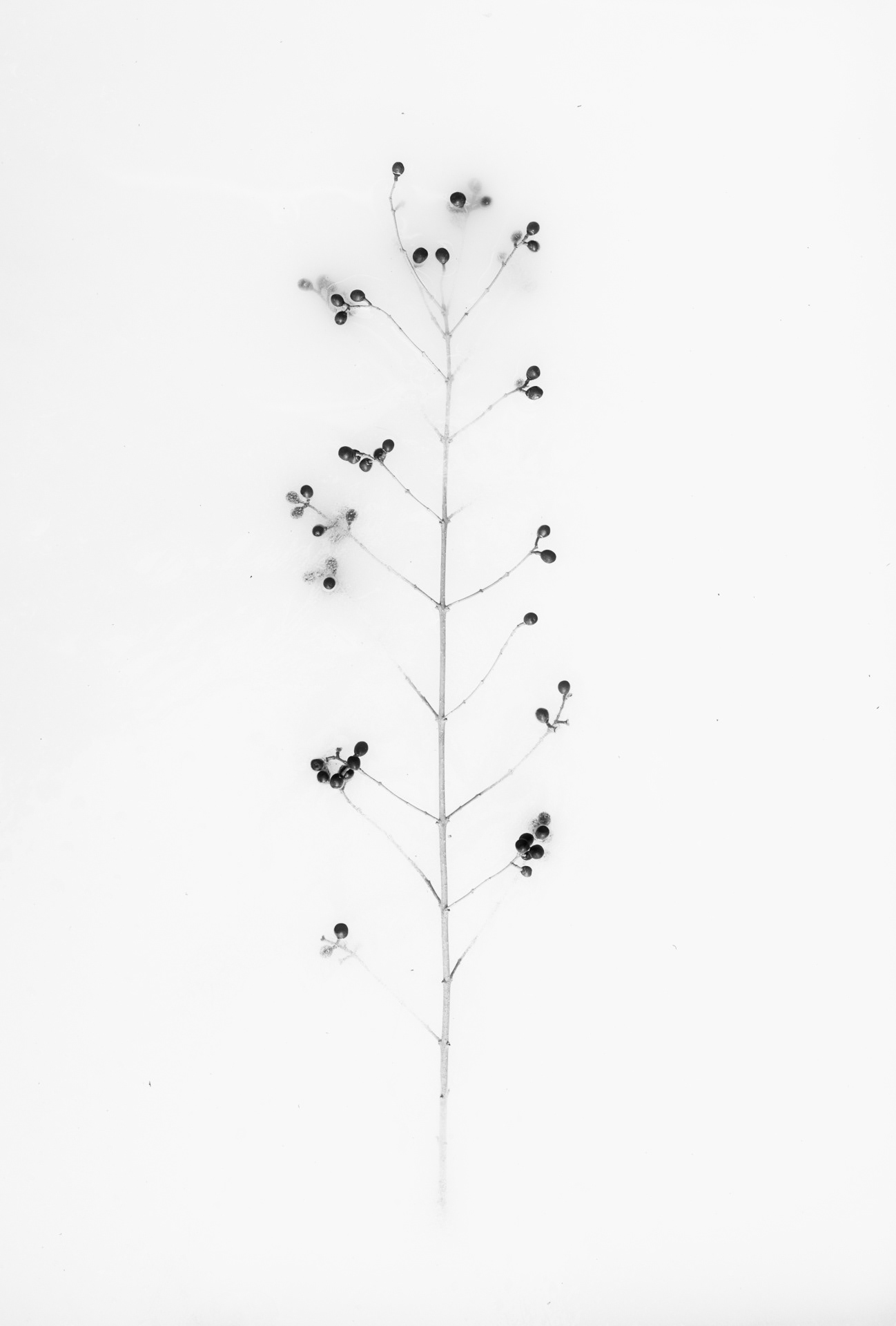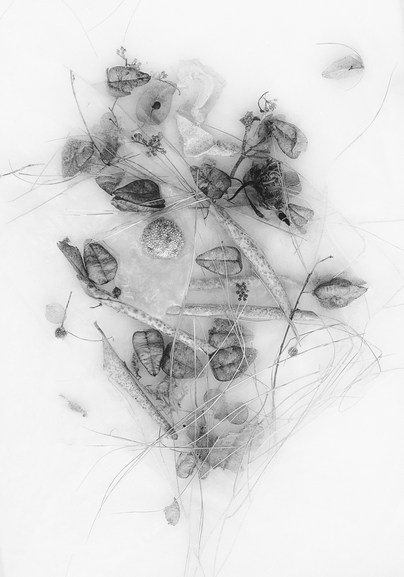 I am drawn to the delicate and sculptural beauty of the plant world, from dried and shriveled leaves and bare branches to sticks, seedpods, seaweed, and berries. In this series, these natural elements are arranged and partially submerged in a shallow container filled with a translucid water-based solution and then frozen. Once the liquid transforms into ice, I photograph the end result.